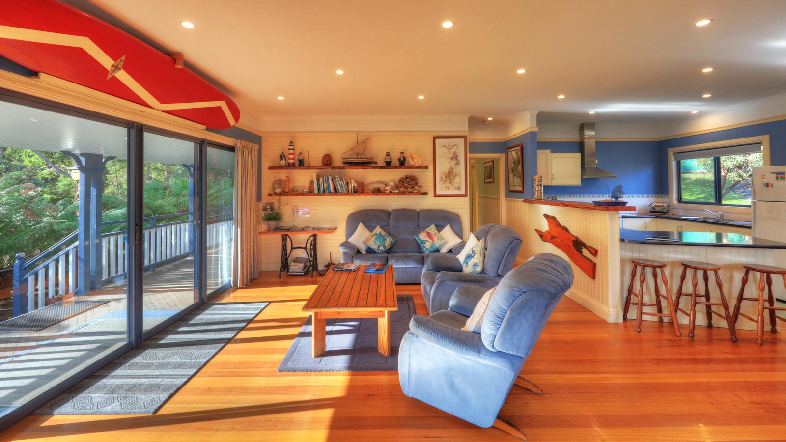 Bruny Island Retreat is a fully self-contained holiday home with three bedrooms, two with queen size beds and a twin room, overlooking magnificent Adventure Bay. The kitchen is fully equipped, with a large open plan dining living area. The laundry has an automatic washing machine and a dryer.